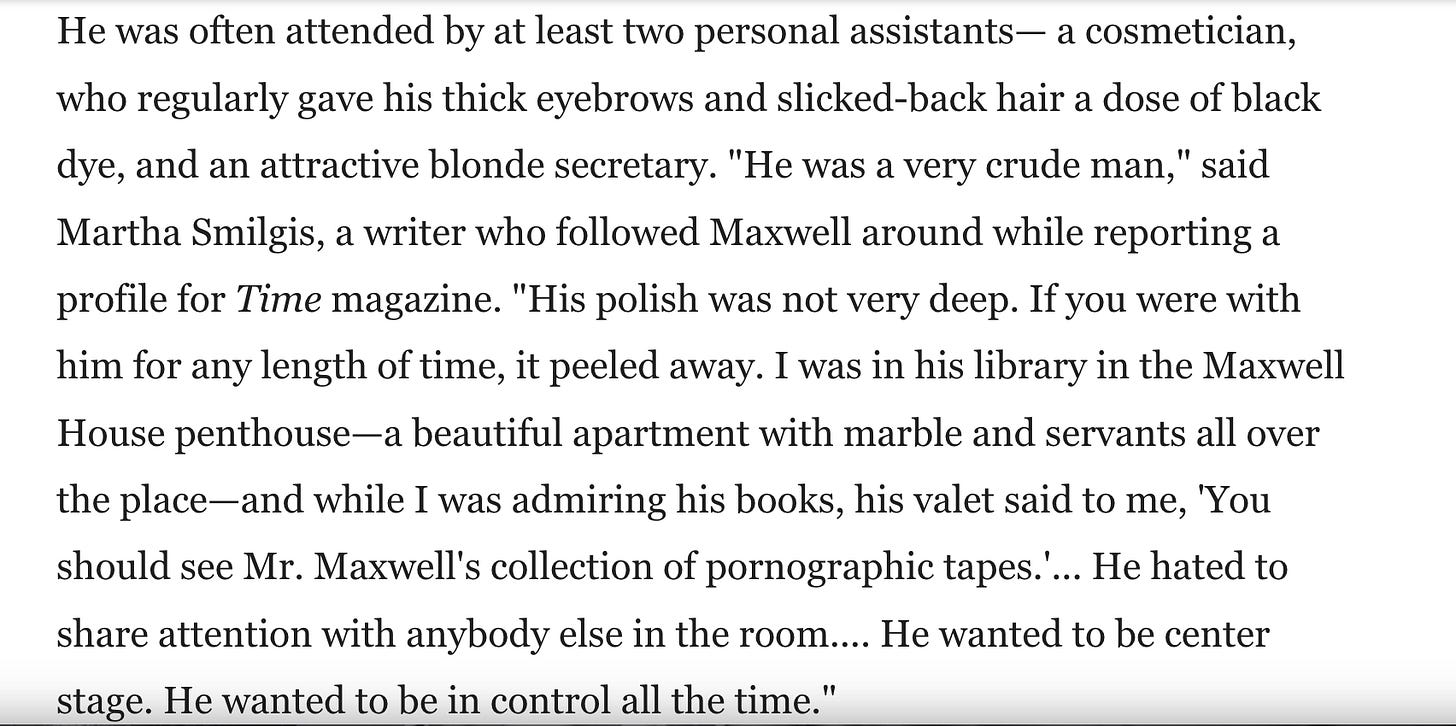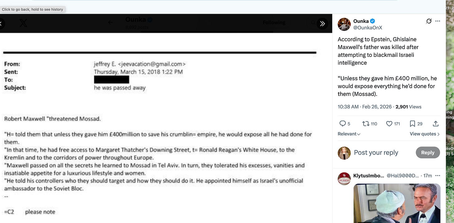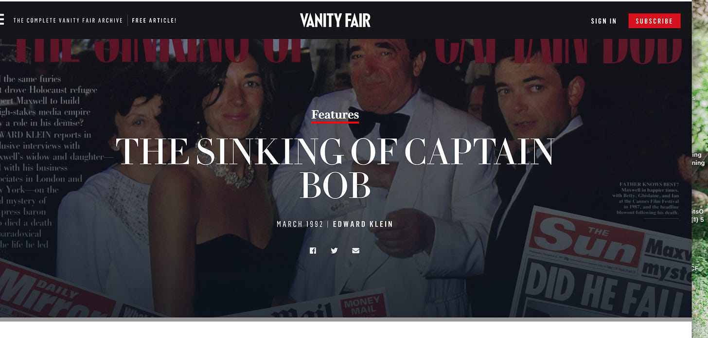 The whale here, the story, is not Jeffrey Epstein, but Robert Maxwell—I have said this many times. All we want to know we have to start with “Robert Maxwell,” (his fifth name) spy for M15, CIA, Mossad, and KGB. Founding father of western scientific press, among other things. Epicenter of blast that ended “western” so called freedom, because he compromised all governments, from Thatcher to Reagan to Clinton and beyond. Promis software installed by the next generation of Maxwells. He is the sine qua non, of it all. Why does he so rarely come up? Even Epstein sleuths avoid the full story, most of it documented, about Robert Maxwell.