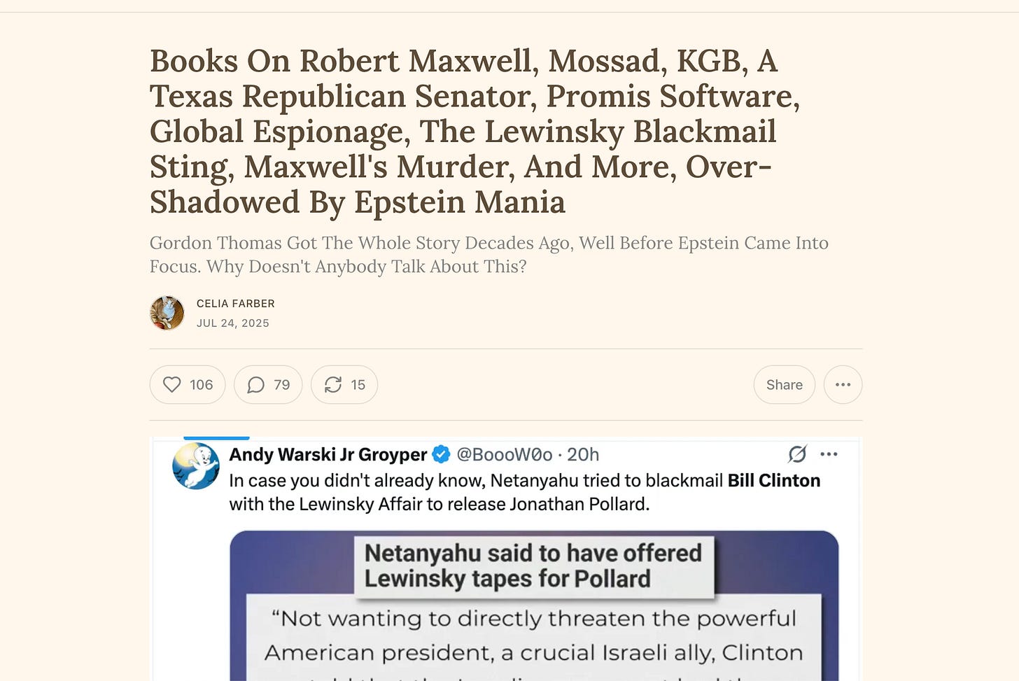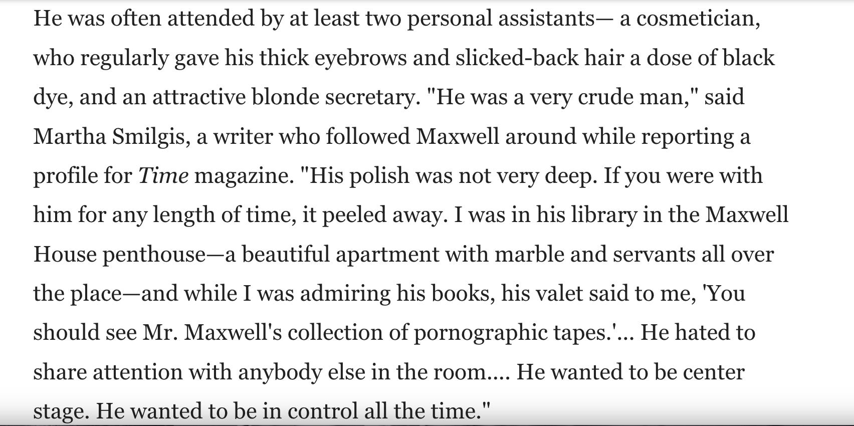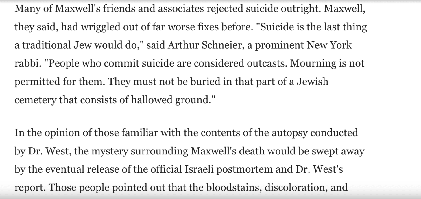 The whale here, the story, is not Jeffrey Epstein, but Robert Maxwell—I have said this many times. All we want to know we have to start with “Robert Maxwell,” (his fifth name) spy for M15, CIA, Mossad, and KGB. Founding father of western scientific press, among other things. Epicenter of blast that ended “western” so called freedom, because he compromised all governments, from Thatcher to Reagan to Clinton and beyond. Promis software installed by the next generation of Maxwells. He is the sine qua non, of it all. Why does he so rarely come up? Even Epstein sleuths avoid the full story, most of it documented, about Robert Maxwell.