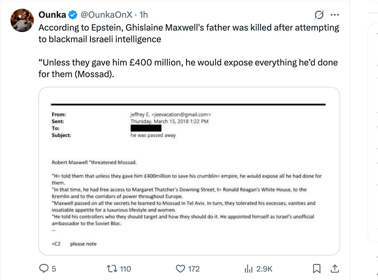 Breaking Bombshell: Epstein Cites In An Email Robert Maxwell Was Killed By Mossad: "He Told Them That Unless They Gave Him 400 Million (Pounds) He Would Expose All He Had Done For Them."