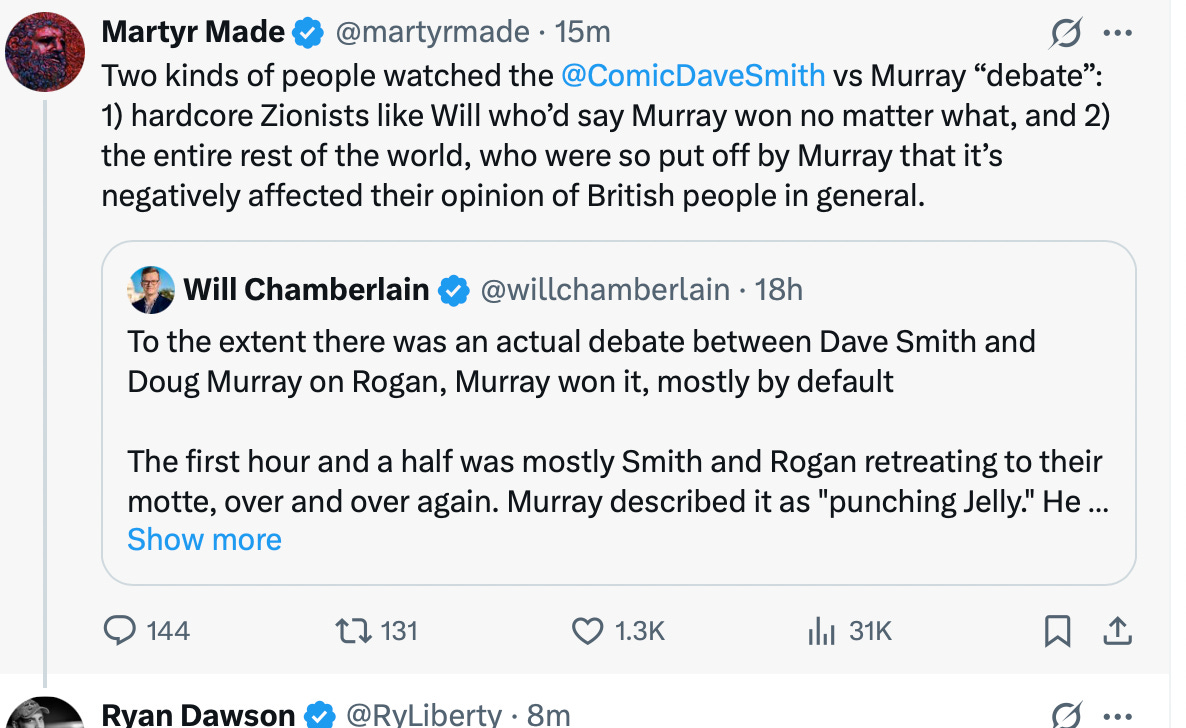 Here, Murray trumpets that history must only be permitted to be stitched by official historians, punches down on Darryl Cooper as being a “would be historian,” though he has never “consumed” any of his work, and berates Rogan for not finding any war he can bring himself to love.