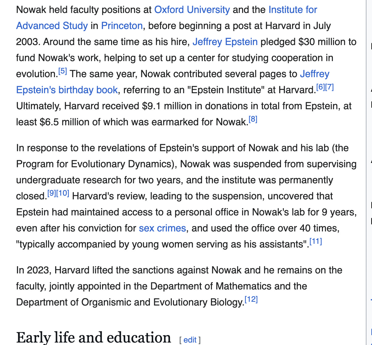 Novak is still employed at Harvard University, which received at least $9.1 million in “donations” from Jeffrey Epstein, of which $6.5 million was earmarked for Novak.