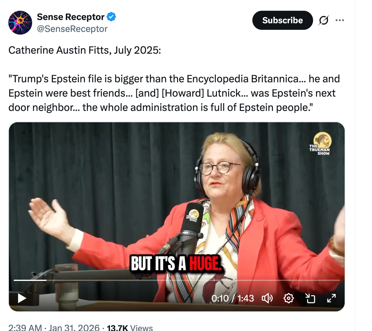 Catherine Austin Fitts: “The whole administration is full of Epstein people.”