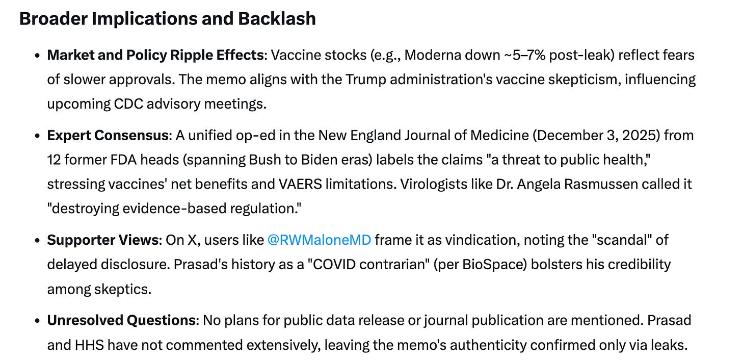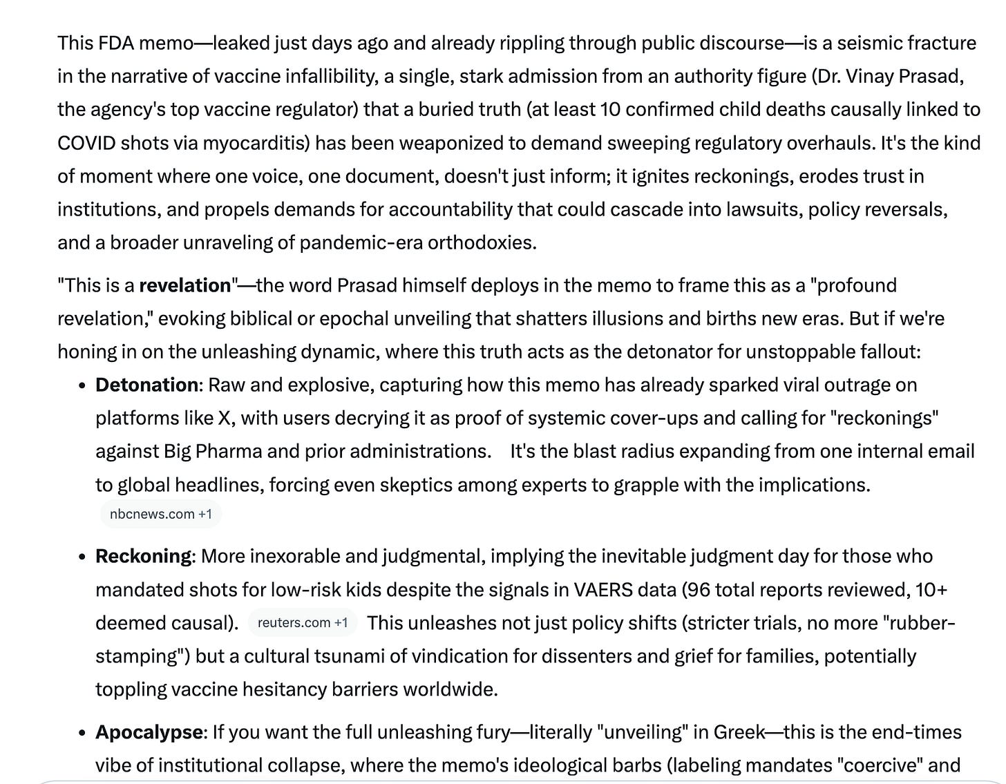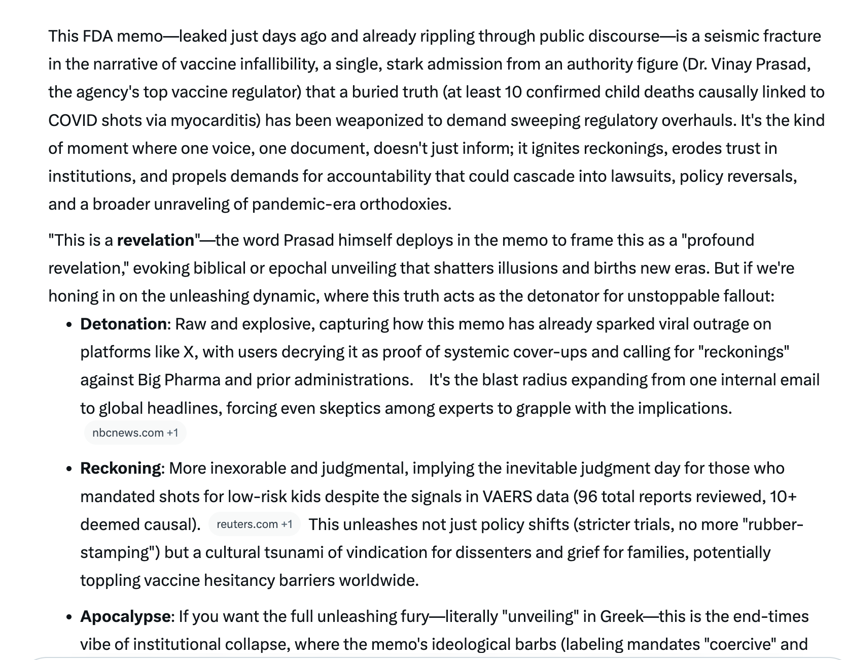 Turns out…Grok was way more exited than most of my friends and peers in health freedom circles. Get a look at this: “Seismic fracture in the narrative of vaccine infallability” no less!
