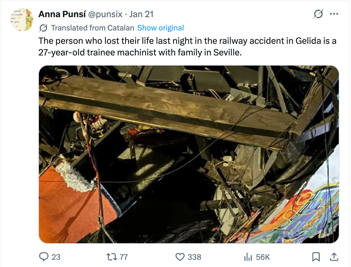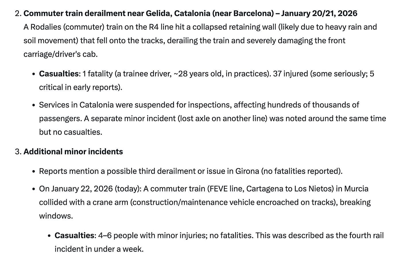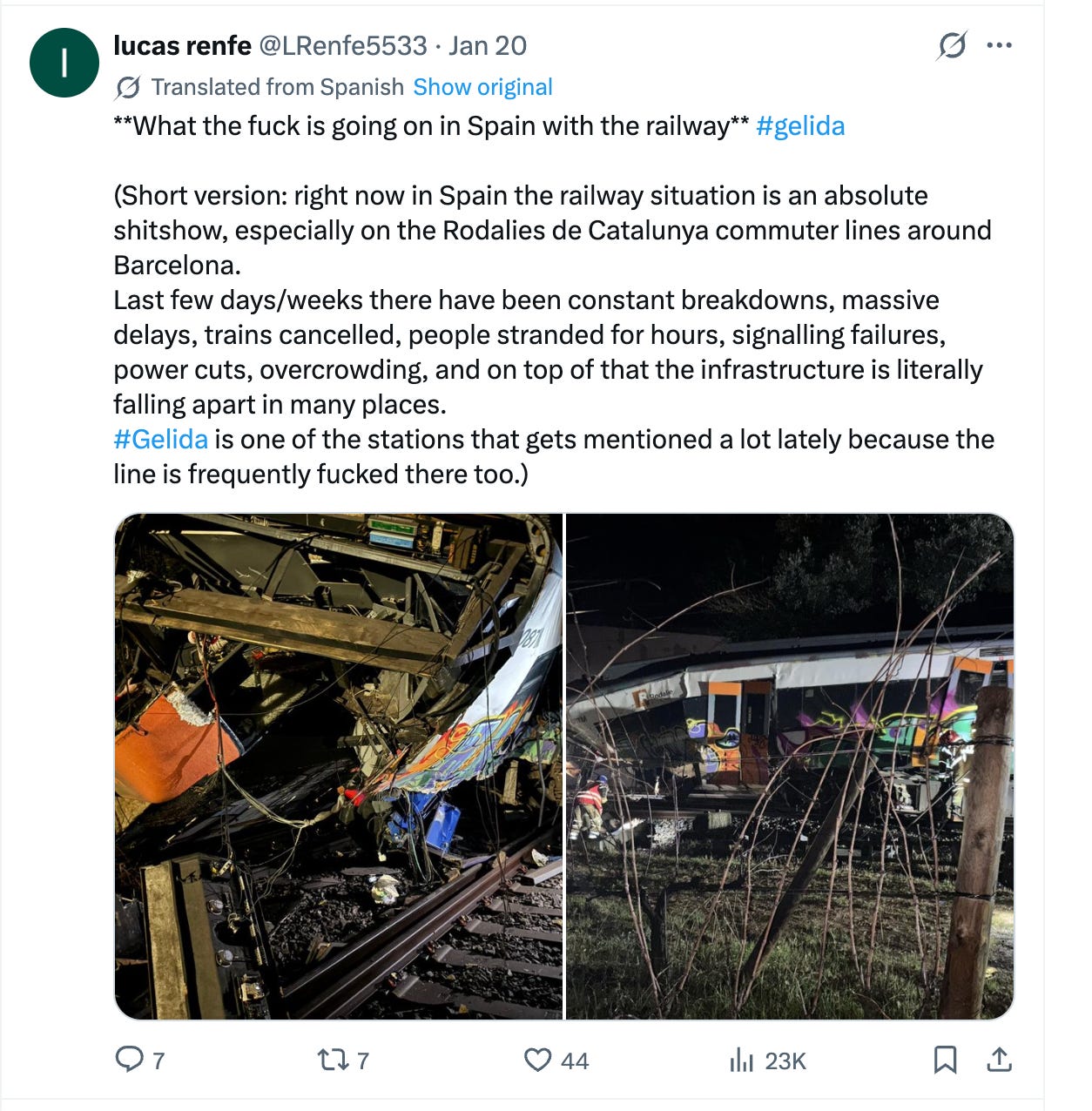 It was reported that there were twelve incidents involving train malfunctions in Catalonia on Jan 20/21, with the one that involved one fatality (the conductor) being the only one reported. Some people are also in critical condition from the accident near Gelida.