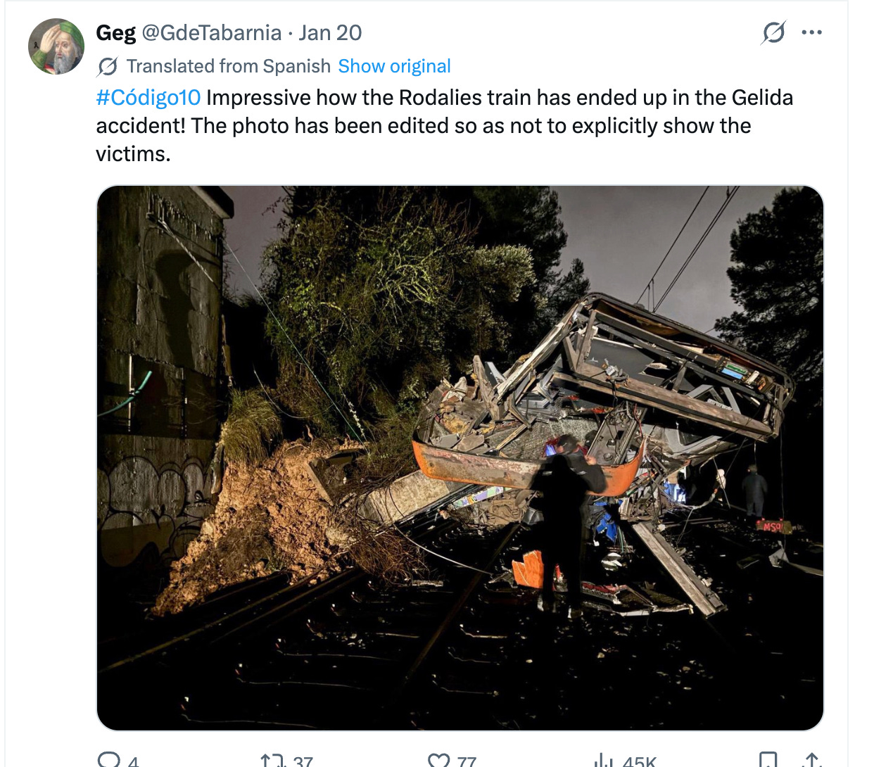 Spanish voices on the internet should be listened to. Mostly, like Agent Roger, they point to deep corruption, while non Spanish observers draw a blank, or feel that at least the big accident (death toll now 45) involving TWO derailments and one collision, in Andalucía earlier this week might be sabotage/terrorism, or some kind of mass mind assault from some transnational entity or entities.
