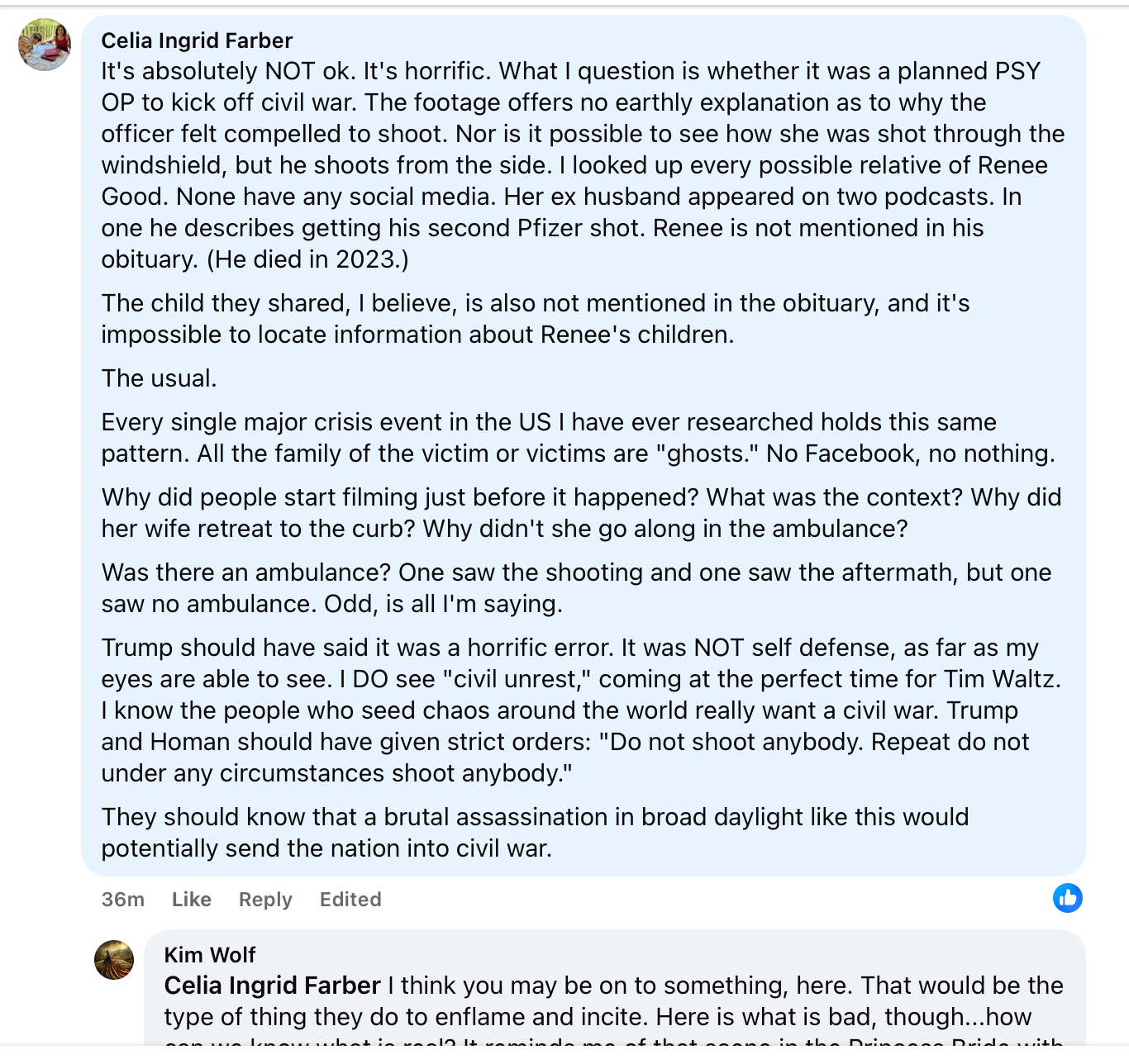Based on the videos from Minneapolis, taken at face value, (as nothing should be taken) I personally do not see anything that would necessitate the ICE officer to shoot. I don’t personally see it, but I wouldn’t base anything on that. The video makes no sense to me, quite apart from all political blinders one may have in either direction.