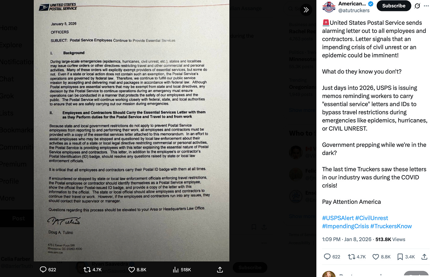 It is simply the observation that what allegedly happened in Minneapolis on Jan 7 has massive disruptive potential—the nation may be, not for the first time, on the brink of civil war. On January 5th, US Postal workers got this letter, preparing them for what sounds like civil unrest: