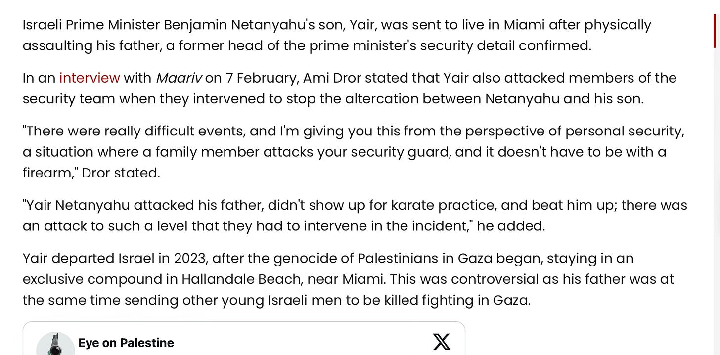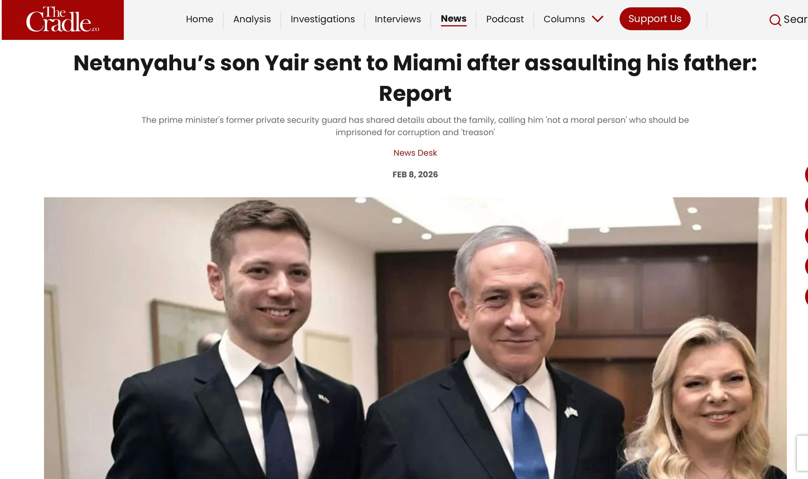 Netanyahu's Former Security Details Reveals That His Son Yair Was Sent To Miami After Assaulting His Father And Other Members Of Security Team. Report By Independent Outlet "The Cradle"