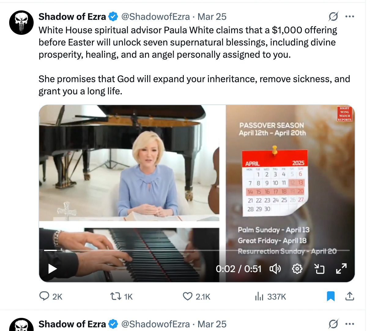 Re-Defining "Grift" For Only $1,000 The White House Spiritual Advisor Says God Will Unlock Seven Supernatural Blessings And Assign You An AngelCelia FarberMar 27, 20251489713ShareLink here.I didn’t know there was a “White House Spiritual Advisor.”This is truly incredible.PreviousNext