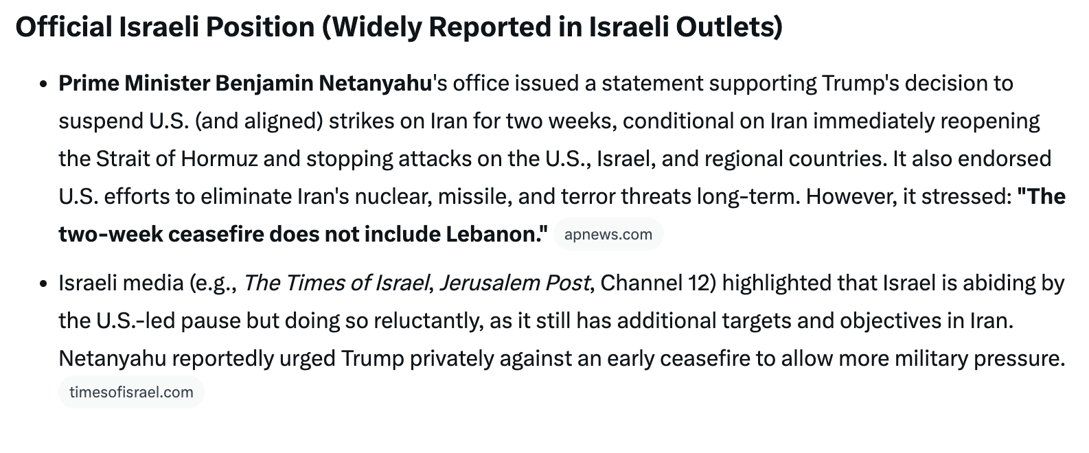 Sour Grapes: Israel Not Happy With Two Week Ceasefire Between US and Iran, Says It Is Abiding "Reluctantly," But Stresses The Deal "Does Not Include Lebanon."