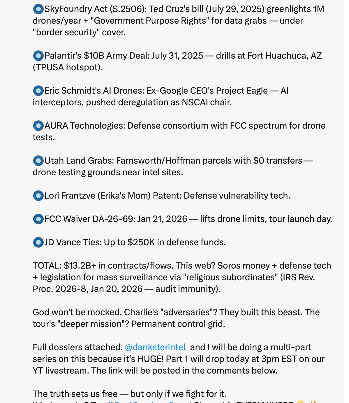 "I struggle to be factually persuaded Charlie Kirk died, or died that day, or that way. I also struggle mightily to accept that those children in those videos were really the children of either of them" this is also where I land. Charlie Kirk seems to be a manufactured persona that finished his role. Erika is another story..I watched as her own website and back story was built within days of Charlie's "murder."