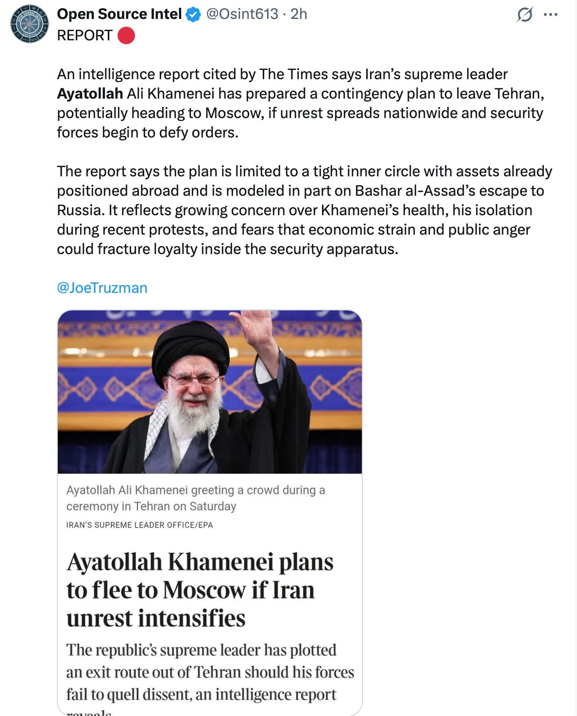 Unconfirmed Reports Say Khamenei Is Fleeing To Moscow, After Vowing Crackdown On Street Protests In Iran That Have Killed At Least 16 In Last 8 Days. Trump Says US "Locked And Loaded" To Intervene