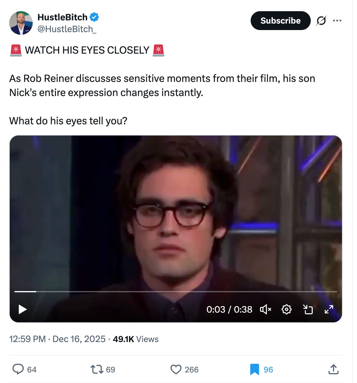 When I watched this clip, I also got a sinking feeling about Nick Reiner’s eyes and demeanor. What jumped out at me, in addition to the despair in the eyes, was the highly symbolic way his microphone falls to the side, as an expression of total resignation.