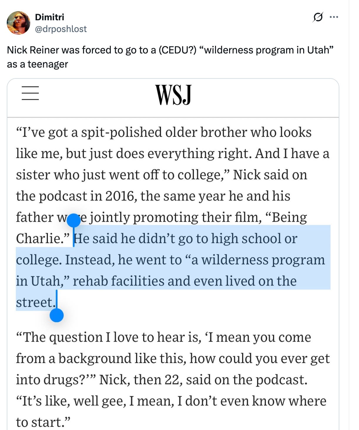Nick Reiner “didn’t go to high school or college,'“ but did go to a torture camp for children of the wealthy.