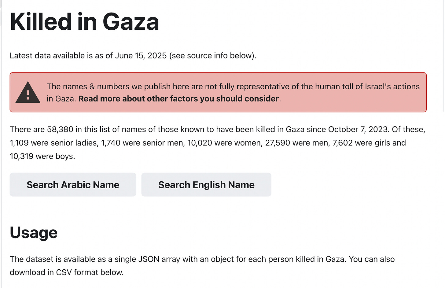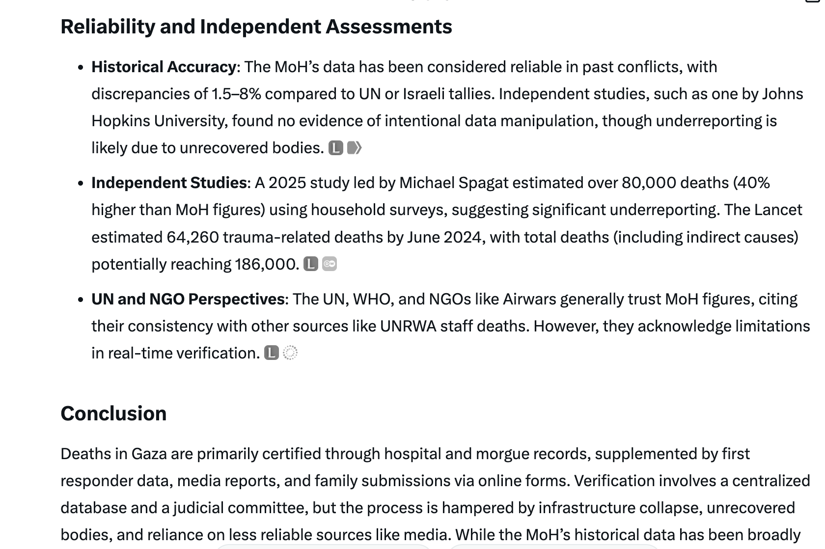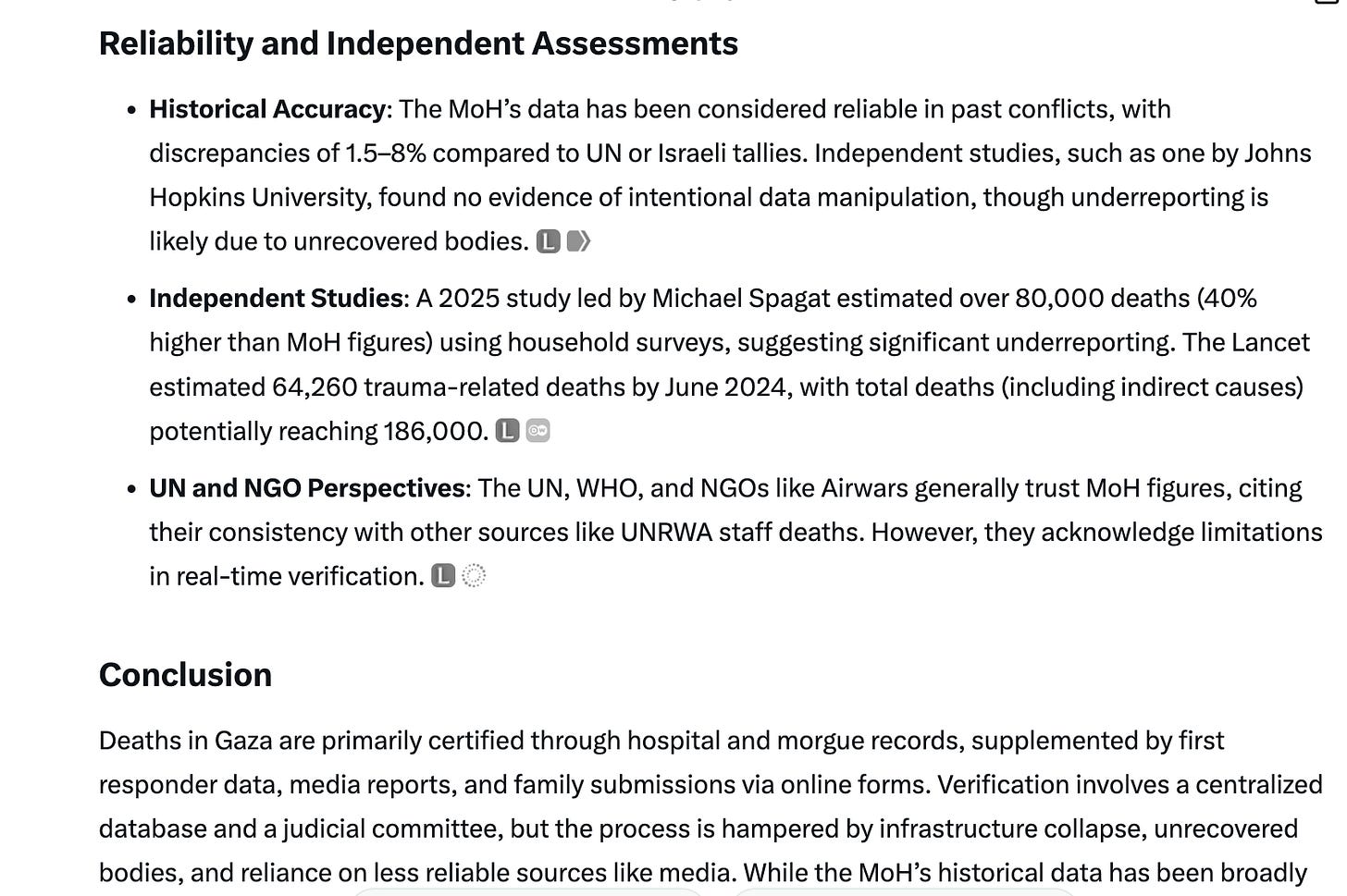 At one point, I spent a day researching how exactly Gaza deaths are certified. The screenshot below covers enough bases, for the time being, to dismiss this straw man argument. (MoH is the Gaza Ministry of Health.) The only real reason for questionable death count is that a great many bodies are buried under the rubble. A few sites have listed the names and ages of all the dead.