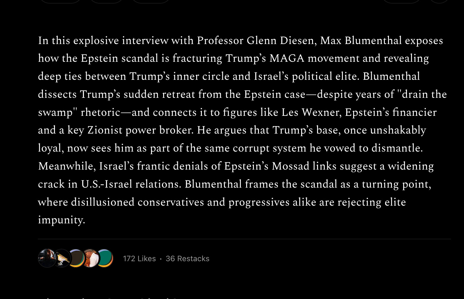 Also: Max Blumenthal Details The Fracturing Of American Allegiance To Israel And The Trump Base's Splintering Over Epstein. Didn't I Always Say MAGA And Trump Are Different?